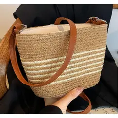 Ψάθινη Τσάντα με Καφέ Λουράκι και Άσπρες Ρίγες
