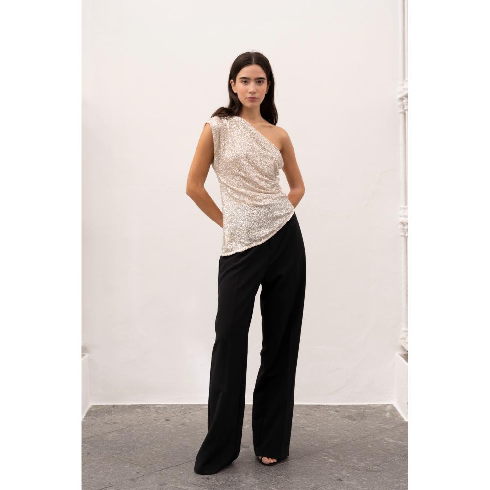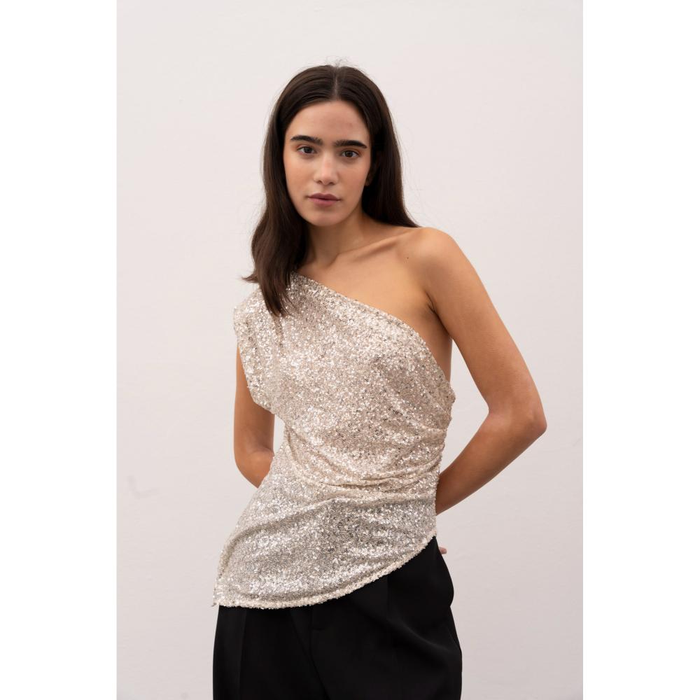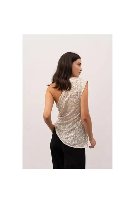 Λάμψτε με το εκθαμβωτικό ασύμετρο τοπ από ασημί παγιέτα, ιδανικό για ξεχωριστές εμφανίσεις. Διαθέτει σούρα στη μία πλευρά της μέσης για μοντέρνο και κολακευτικό αποτέλεσμα, ενώ το ιδιαίτερο ασύμετρο κόψιμο αναδεικνύει την κομψότητά σας. Ένα statement κομμάτι που θα κάνει τη διαφορά σε βραδινές εξόδους και glam περιστάσεις.