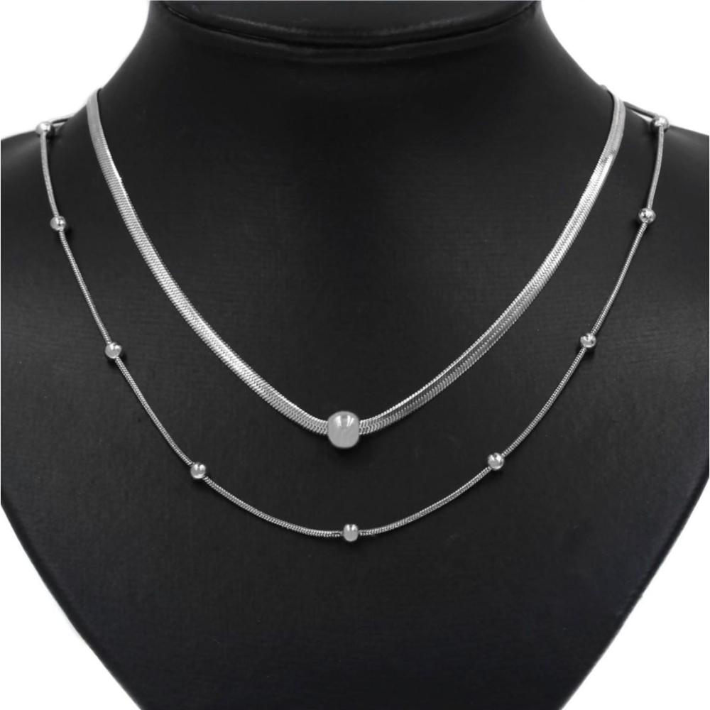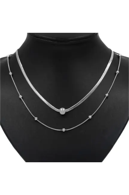 Ατσάλινο διπλό κολιέ με δύο ξεχωριστές αλυσίδες που συνδυάζουν μοναδικά το στυλ και την κομψότητα. Η μία αλυσίδα διαθέτει σχέδιο ψαροκόκκαλου για μια μοντέρνα και δυναμική αίσθηση, ενώ η άλλη είναι λεπτή και διακοσμημένη με ατσάλινες μπίλιες που προσθέτουν μία διακριτική, εκλεπτυσμένη πινελιά. Αυτό το κολιέ είναι ιδανικό για να το φορέσετε σε κάθε περίσταση, είτε για καθημερινή χρήση είτε για πιο επίσημες εμφανίσεις. Ο συνδυασμός των δύο διαφορετικών σχεδίων το καθιστά εξαιρετικά εντυπωσιακό και κομψό, ενώ η ανθεκτικότητα του ατσαλιού εξασφαλίζει μακροχρόνια χρήση.