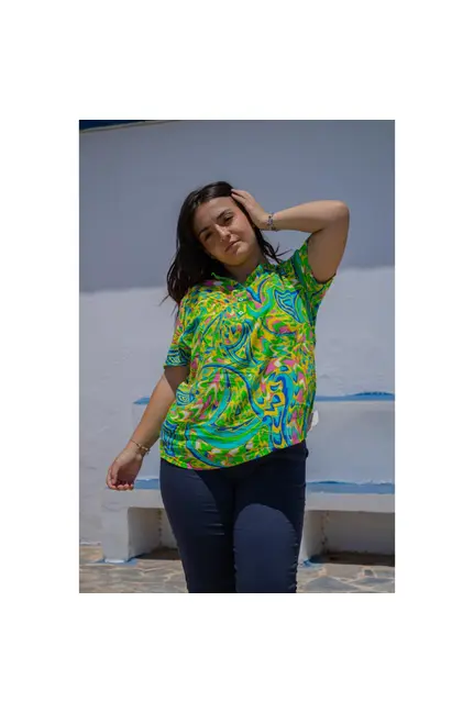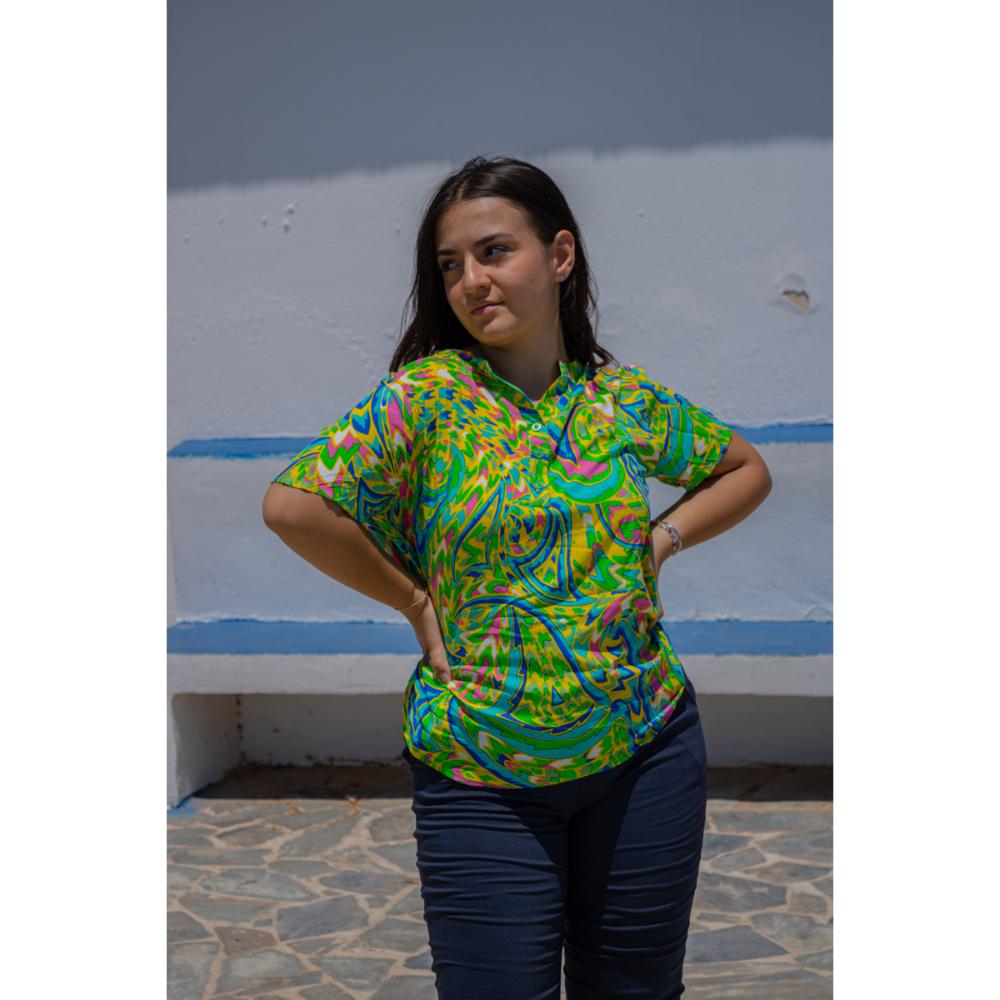 Αυτή η μπλούζα είναι κατασκευασμένη από βαμβάκι και βισκόζη, εξασφαλίζοντας απαλή και αναπνεύσιμη υφή για απόλυτη άνεση κατά τη διάρκεια της ημέρας. Το κίτρινο εμπριμέ σχέδιο με πολύχρωμα μοτίβα χαρίζει έναν χαρούμενο και ζωντανό χαρακτήρα που θα εντυπωσιάσει.