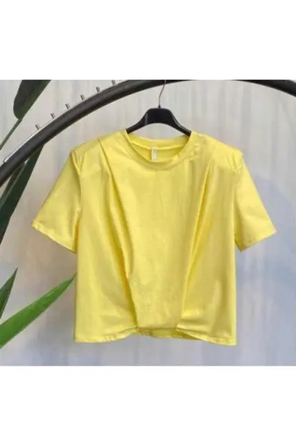 Κοντομάνικη μπλούζα σε έντονο κίτρινο χρώμα, με ενσωματωμένες βάτες στους ώμους που τονίζουν τη σιλουέτα και δημιουργούν κομψή, ανάποδη τριγωνική γραμμή στο σώμα. Το ελαφρώς ελαστικό ύφασμα με βαμβάκι και ελαστάνη προσφέρει άνεση και σταθερή εφαρμογή. Ένα statement basic που απογειώνει κάθε απλό outfit.Καλύπτει S-XL