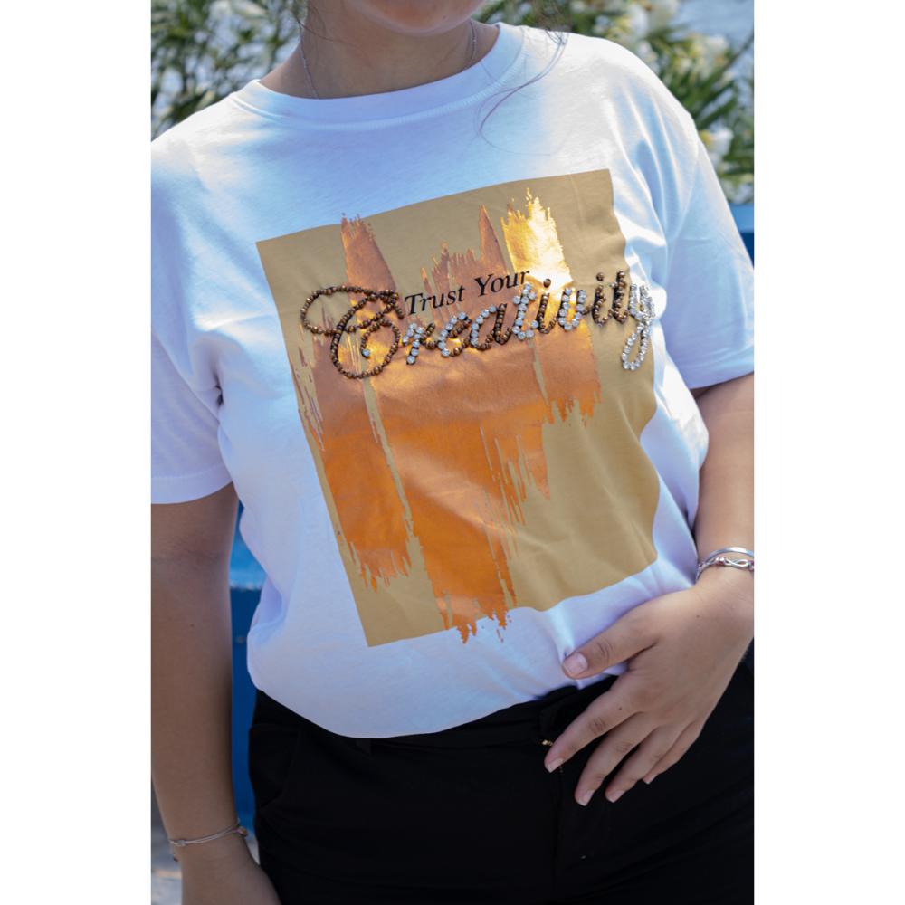 Αυτή η λευκή μπλούζα με τύπωμα και στρας θα κλέψει τις εντυπώσεις κάθε φορά που τη φοράτε!
