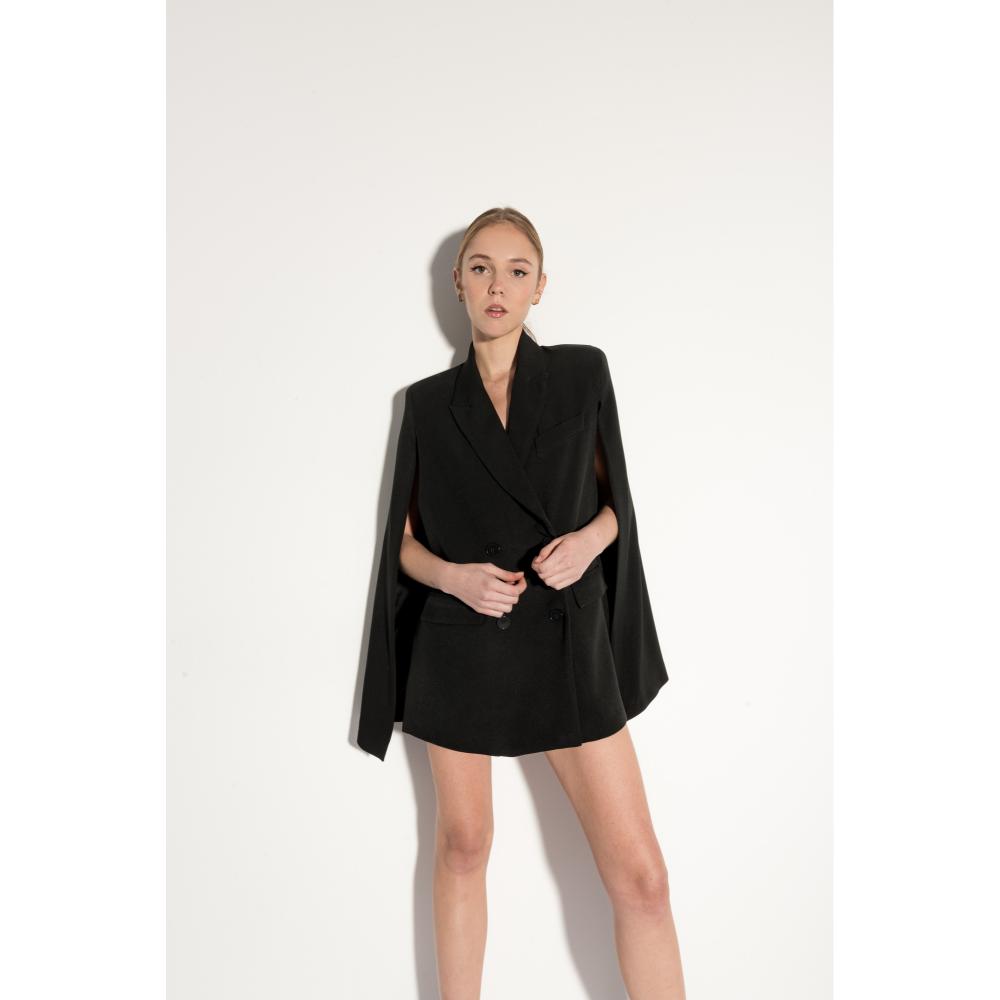 Κομψή κάπα-blazer σε μαύρο χρώμα για μοναδικές και εκλεπτυσμένες εμφανίσεις. Συνδυάζει την κομψότητα ενός blazer με την ιδιαίτερη σιλουέτα μιας κάπας, προσφέροντας ένα statement look. Με διπλό κούμπωμα, αυστηρές γραμμές και καθαρές λεπτομέρειες, είναι η τέλεια επιλογή για βραδινά σύνολα ή επαγγελματικές περιστάσεις που απαιτούν στυλ και άνεση.Υλικό: 95% polyester, 5% elastane