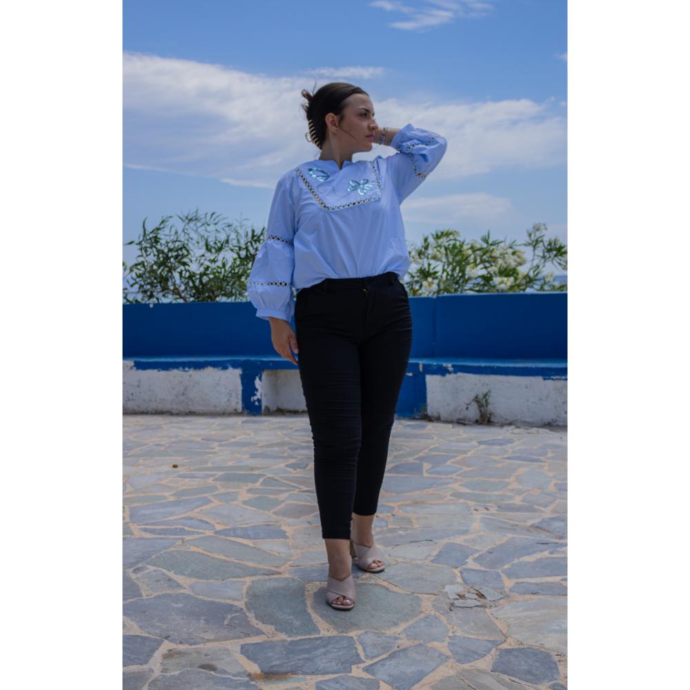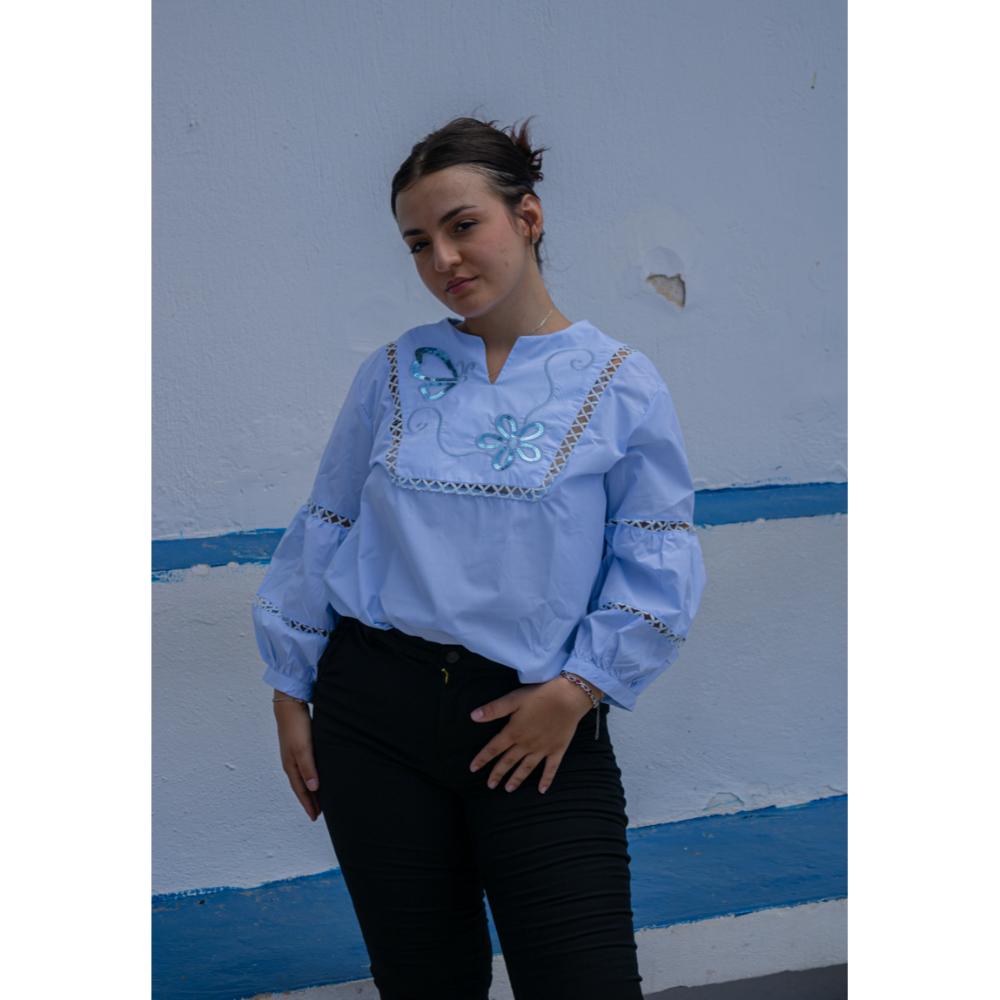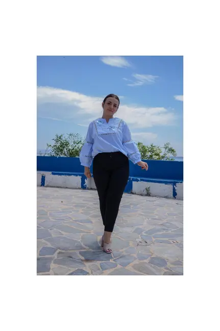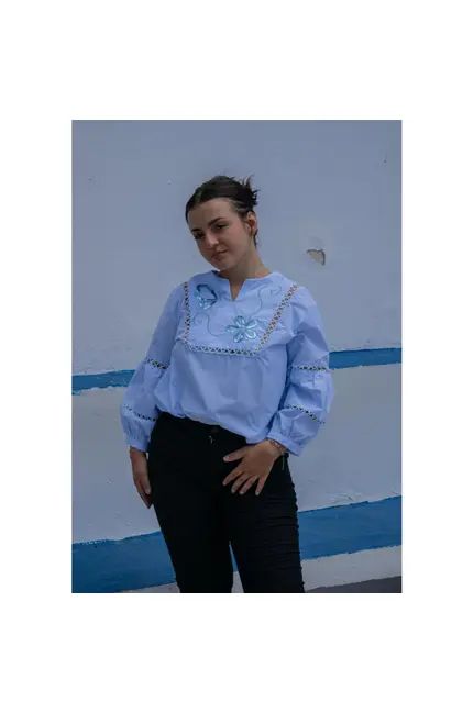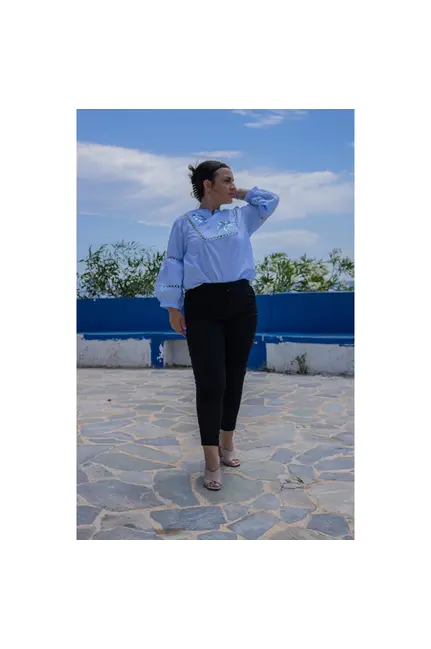 Υιοθετήστε τον κομψό και διαχρονικό στυλ με αυτήν την μπλούζα από σταθερό βαμβάκι σε γαλάζιο χρώμα, τονίζοντας το με μοναδικό κέντημα. Κατασκευασμένη από 100% cotton, αυτή η μπλούζα προσφέρει άνεση και κομψότητα σε κάθε εμφάνισή σας.Χαρακτηριστικά Προϊόντος:
