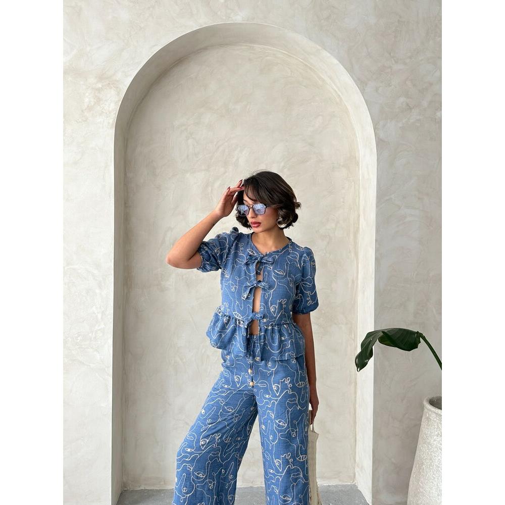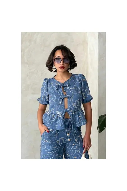 Αέρινη μπλούζα με παιχνιδιάρικο δέσιμο μπροστά, βολάν στη μέση και μοντέρνο κέντημα που δίνει χαρακτήρα. Ιδανική για καλοκαιρινές εμφανίσεις με κομψό και ανάλαφρο στυλ. Η γραμμή της αγκαλιάζει το σώμα χωρίς να πιέζει, προσφέροντας στυλ και άνεση.Σύνθεση: 100% Λινό