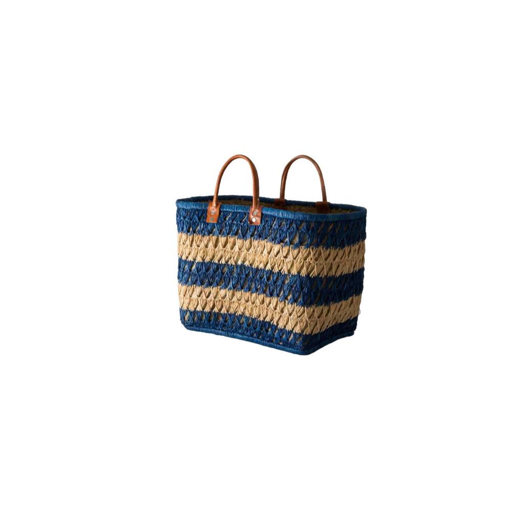 Χειροποίητη τσάντα από τη Μαδαγασκάρη με πλέξη σε μπλε και φυσικό τόνο, σχεδιασμένη για καθημερινή χρήση με αισθητική και περιβαλλοντική ευαισθησία. Προϊόν fair trade, αποτέλεσμα υπεύθυνης συνεργασίας με τοπικούς τεχνίτες.