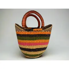 Αυθεντική χειροποίητη τσάντα από τη Γκάνα, κατασκευασμένη από φυσικές ίνες και βαμμένη με έντονα, πολύχρωμα μοτίβα. Διαθέτει ενισχυμένα δερμάτινα χερούλια και μοναδικό κυρτό σχήμα. Πρόκειται για προϊόν fair trade, υποστηρίζοντας απευθείας αφρικανούς τεχνίτες και τις τοπικές κοινότητες.