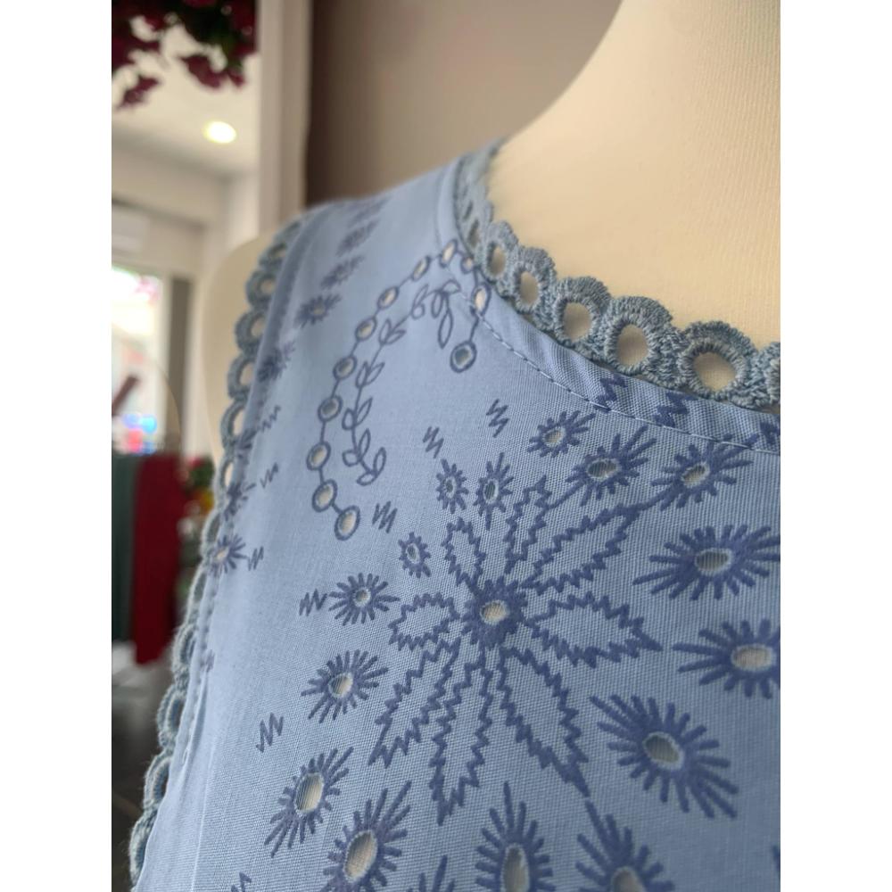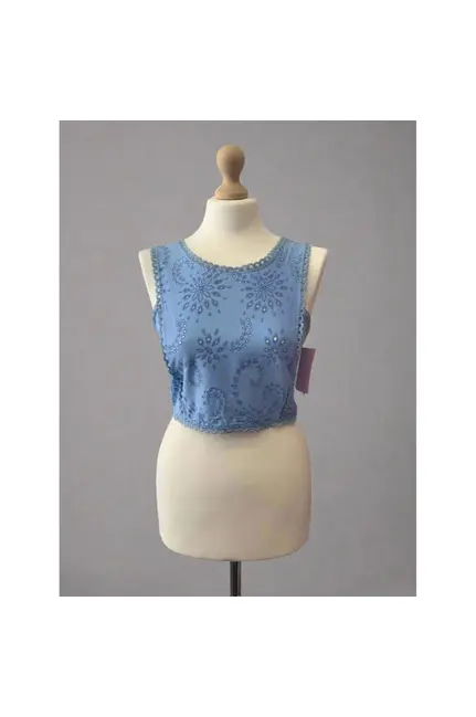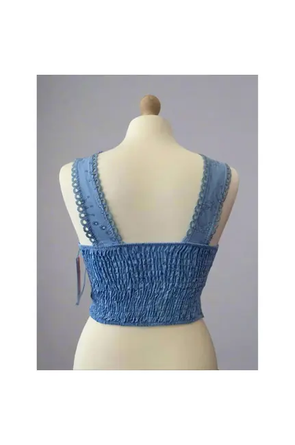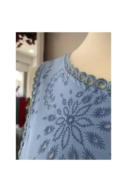 Ανανεώστε τη συλλογή σας με αυτό το κομψό τοπ σε σιέλ απόχρωση, διακοσμημένο με περίτεχνα μπροντερί μοτίβα. Ιδανικό για καλοκαιρινές εμφανίσεις, διαθέτει ελαστική πλάτη για άνεση και σταθερή εφαρμογή.Καλύπτει XS-M